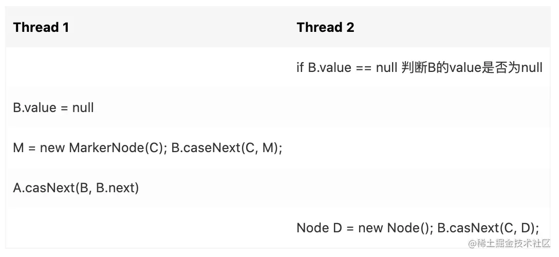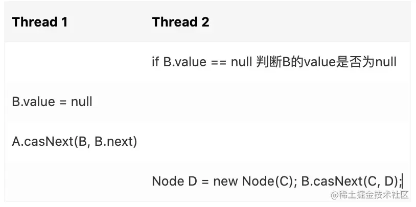 1. Thread 2 准备在B的后面插入一个节点 D, 它先判断 B.value == null, 发现 B 没被删除(假设 value = null 是删除)