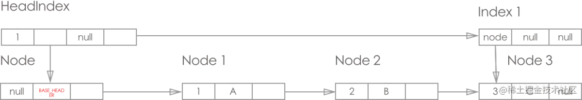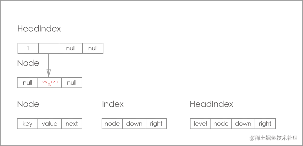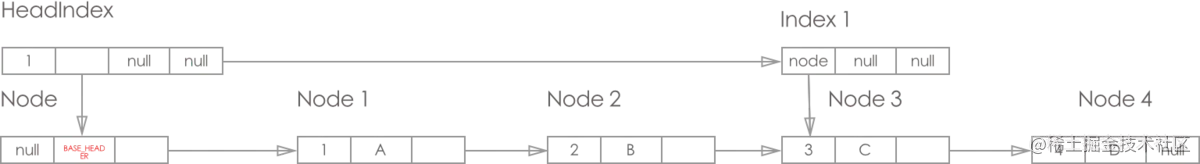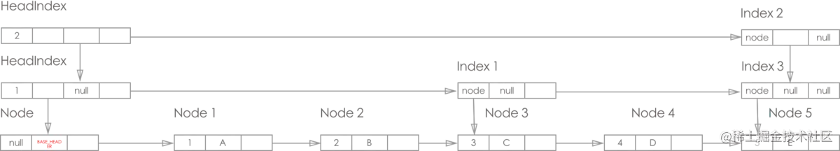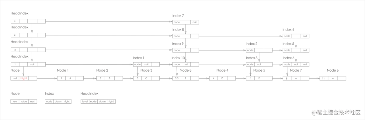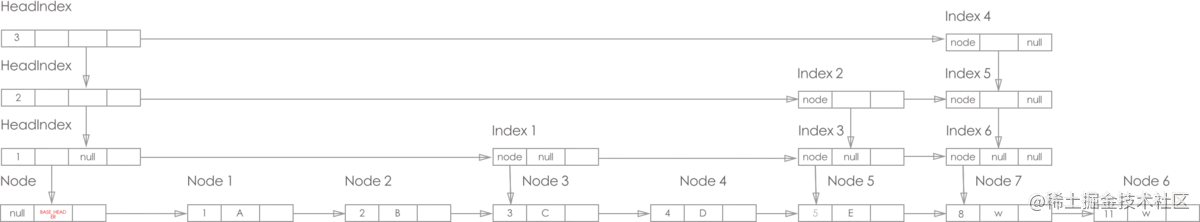 - 从纵向链表来看, 最左边的是 HeadIndex 层, 右边的都是Index 层, 且每层的最底端都是对应Node, 纵向上的索引都是指向最底端的Node(这一点图片为了美观就没体现)