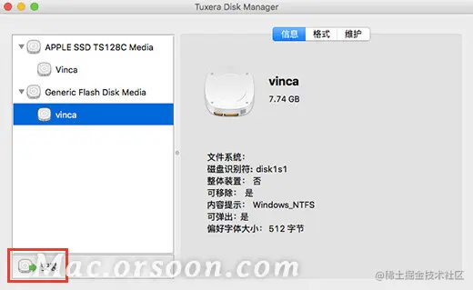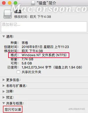 在Mac中打开磁盘的简介会发现Mac对NTFS格式磁盘只有“只读”权限,无法进行写入存储文件,所以我们要拓展Mac对此类文件系统的使用权限。