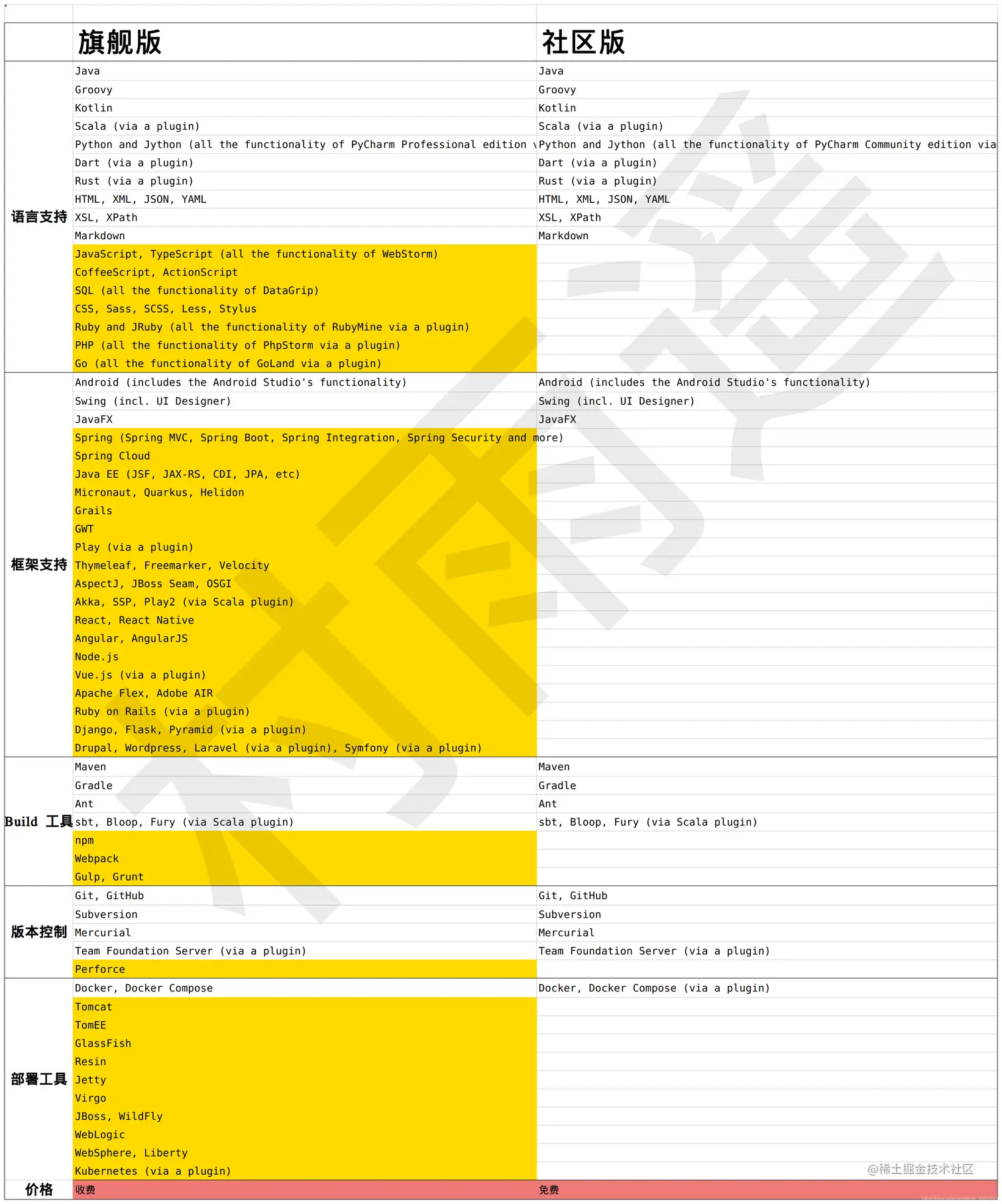 对于旗舰版和社区版,我从官网给出的对比从而摘选了如下图所示的区别。可以看出旗舰版无论在 语言支持、框架支持、Build 工具、部署工具、版本控制 等多方面都比社区版更加强大,但是最大的区别也是我们最为关心的一点:旗舰版收费,而社区版免费, 所以可以根据自己的需求进行选择。