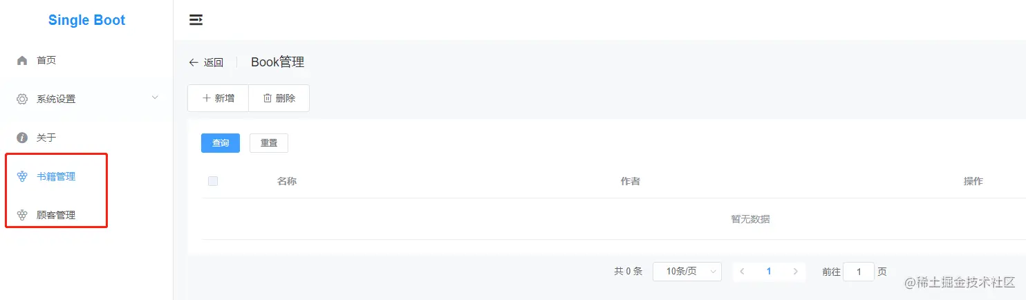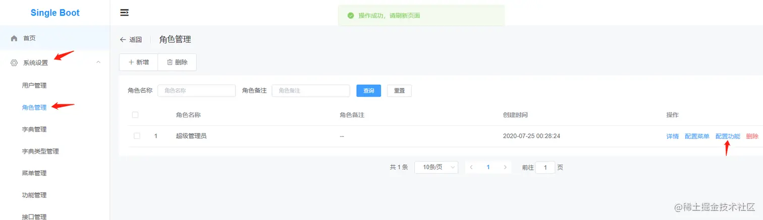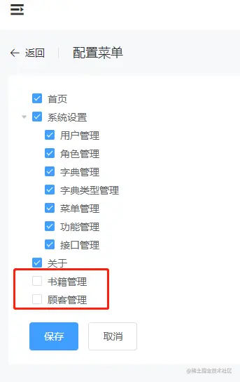 运行项目后,还需要对当前角色配置有权限的菜单和功能,才能使用到代码生成器生成的顾客管理和书籍管理功能