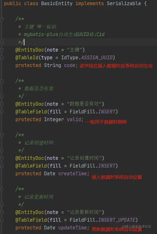 实体类必须继承 com.spz.demo.singleboot.core.entity.BasicEntity 类 BasicEntity类包含了主键字段(code)、数据有效字段、记录创建时间字段、记录修改时间字段,开发人员建立新实体类时无需再声明。BasicEntity类字段如下图:(关于系统自动设置创建时间、修改时间和数据有效字段的逻辑请看此类:com.spz.demo.singleboot.core.config.MybatisPlusMetaObjectHandler)