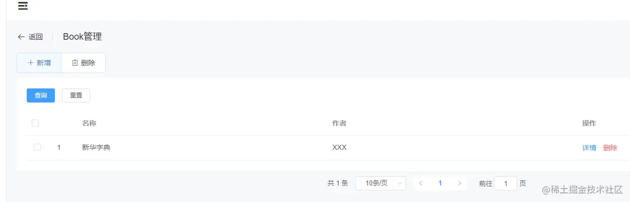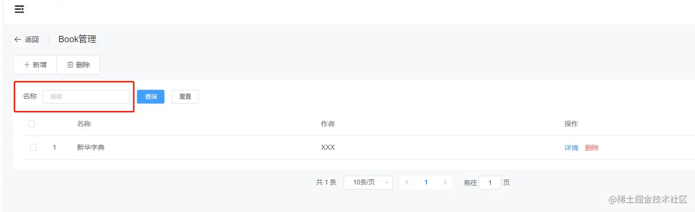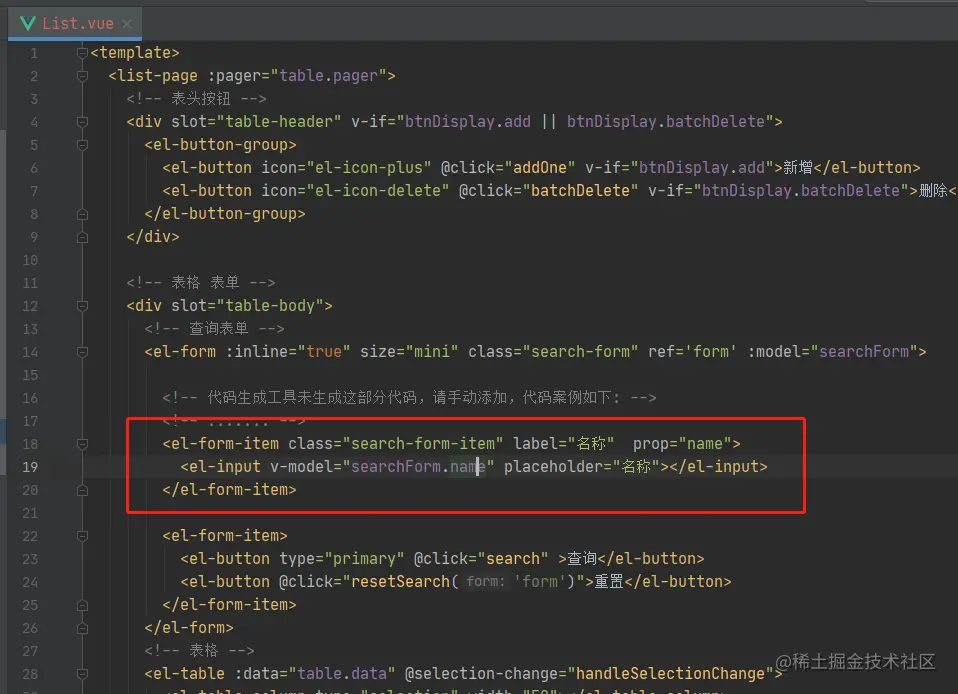 列表页面新增查询字段 注意生成的页面里是没有具体字段的查询的,需要开发人员自行添加,比如需要给书籍管理页面添加按书籍名称查询的字段,则打开"前端项目根目录/src/views/book/List.vue",在下图红框出编写字段:
