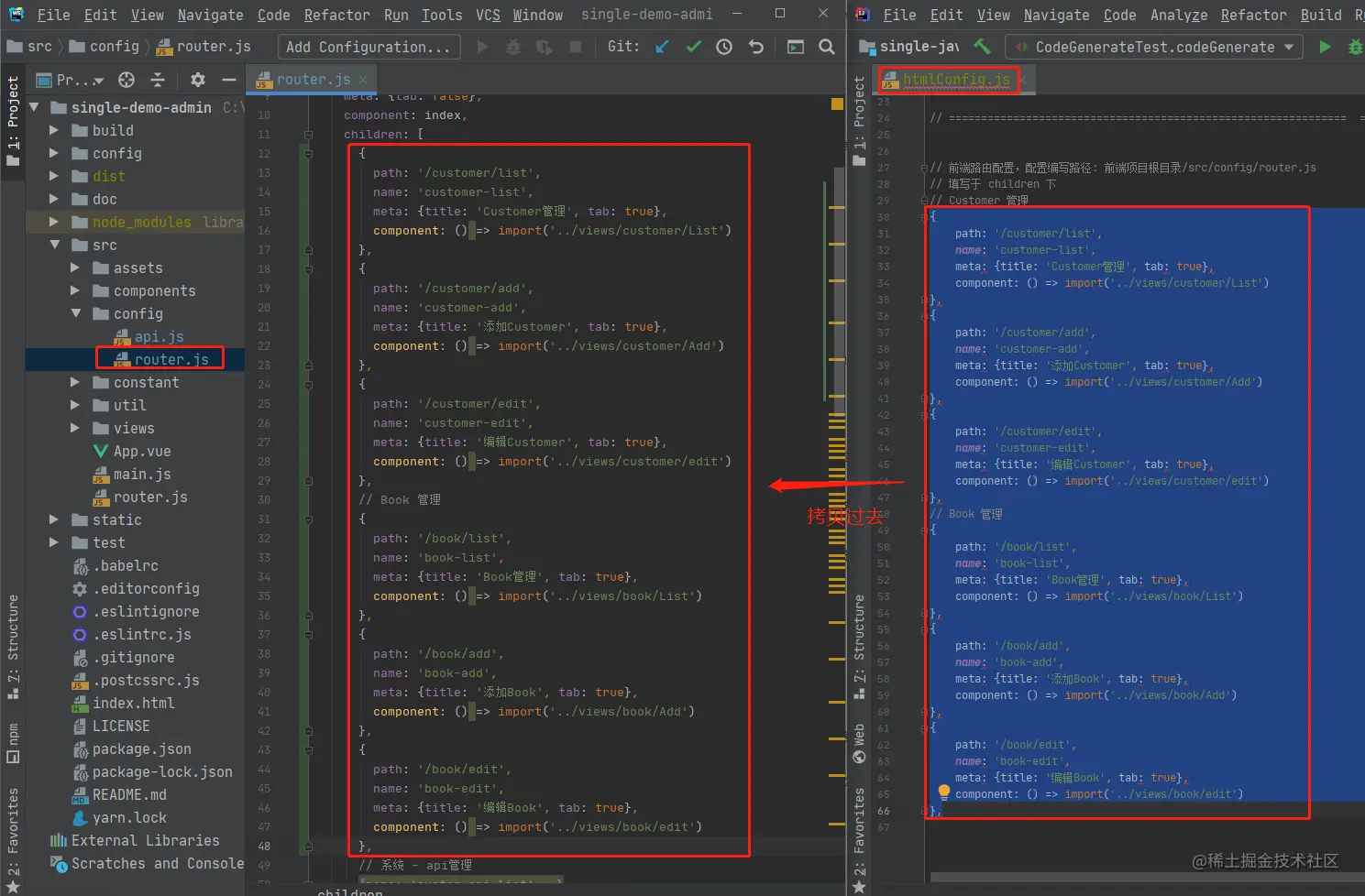 打开"前端项目根目录/src/config/router.js"以及"后端项目根目录/generate/htmlConfig/htmlConfig.js",将路由相关的配置复制到router.js