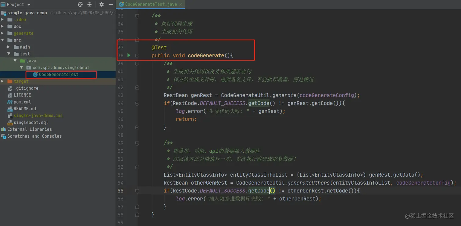 代码生成器执行示例在com.spz.demo.singleboot.CodeGenerateTest下,可直接运行。如下图: