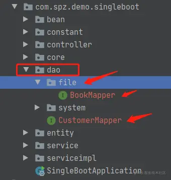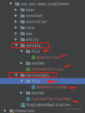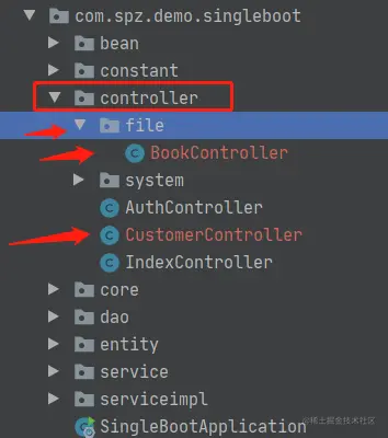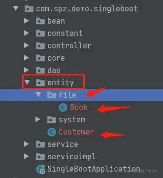 当实体类较多时,开发人员可能需要对众多实体类进行分类,比如系统有关的实体类均放到com.spz.demo.singleboot.entity.system包下; 测试有关的放在com.spz.demo.singleboot.entity.test包下; 也有部分实体类直接放com.spz.demo.singleboot.entity目录下,不需要按目录隔开存。代码生成器遇到非entity包下的实体类时,将会在生成目标代码文件时也进行包分隔。例如Book实体类,存放于com.spz.demo.singleboot.entity.file包下,则生成的控制器类则会放在com.spz.demo.singleboot.controller.file包下,并且该类的RequestMapping根路径为"/file"