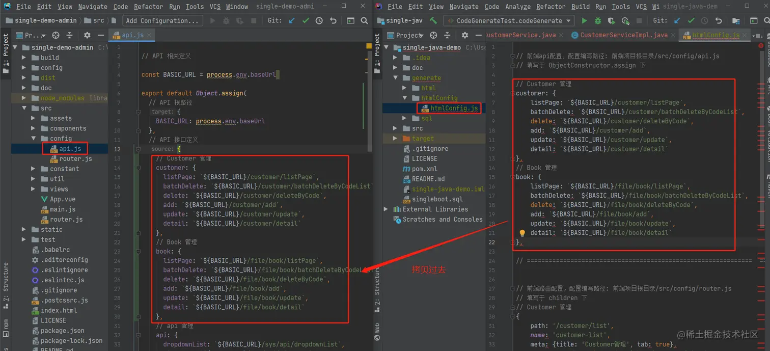 打开"前端项目根目录/src/config/api.js"以及"后端项目根目录/generate/htmlConfig/htmlConfig.js",将api相关的配置复制到api.js