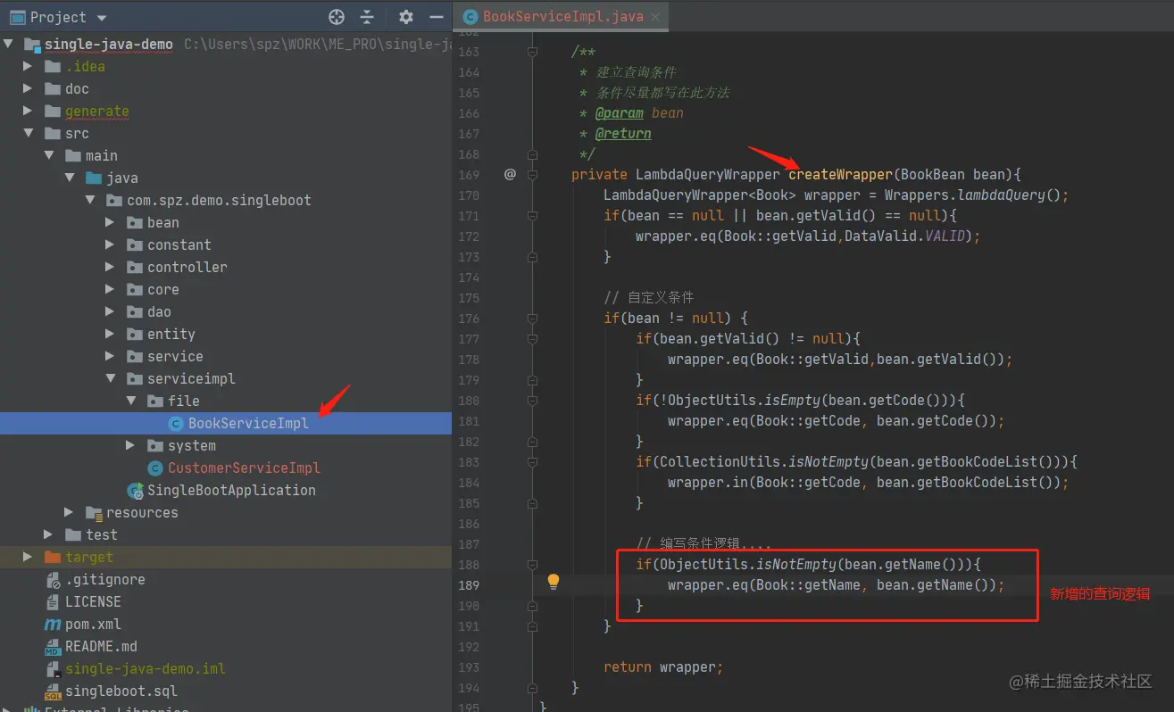 比如开发人员现在需要做一个客户管理功能,客户信息里包含姓名、年龄、两个字段。那么我们就需要写一个符合规范的实体类,该类放于com.spz.demo.singleboot.entity包下
