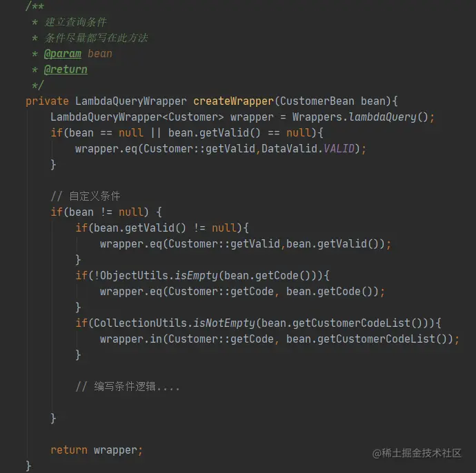 下图为Service实现类里包含的方法,注意createWrapper()方法,建议整个Service实现类里,所有涉及查询的方法均调用createWrapper()方法返回的LambdaQueryWrapper对象来参与查询,而所有查询条件均在createWrapper()方法里编写(注:LambdaQueryWrapper为Mybatis-plus提供的Lambda方式查询)