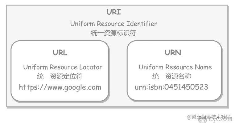 HTTP 使用 URL( U niform Resource Locator,统一资源定位符)来定位资源,它是 URI(Uniform Resource Identifier,统一资源标识符)的子集,URL 在 URI 的基础上增加了定位能力。URI 除了包含 URL,还包含 URN(Uniform Resource Name,统一资源名称),它只是用来定义一个资源的名称,并不具备定位该资源的能力。例如 urn:isbn:0451450523 用来定义一个书籍名称,但是却没有表示怎么找到这本书。