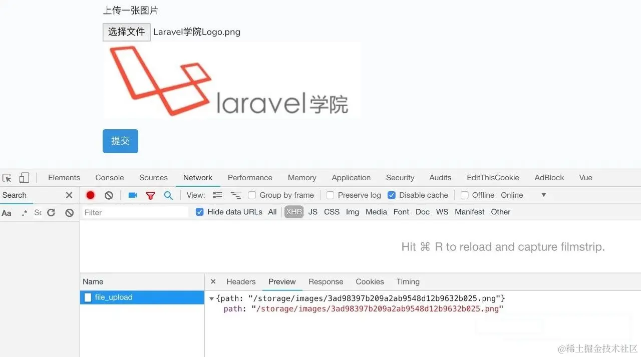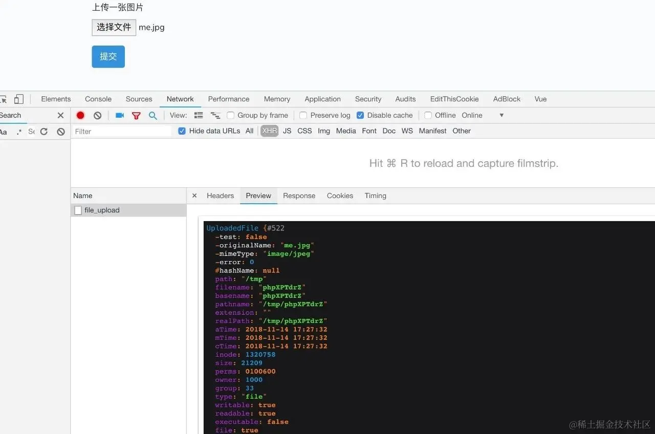 至此,我们完成了前端视图和 Vue 组件的编写,运行 npm run dev 重新编译前端资源,访问 blog.test/form 就可以测试文件上传了,先打开 F12 监听上传请求,然后上传一张图片,上传成功后,就可以看到后端打印的文件信息了: