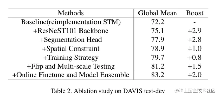 在 test-dev 上的消融实验。达摩院复现的 STM 达到了和原文一致的结果。在各种 trick 的加持下, 得到了 11 个点的提升。