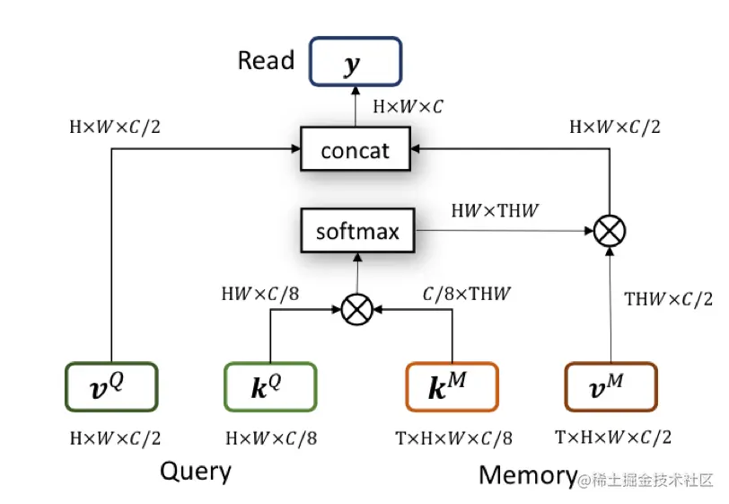 达摩院的算法基于 2019 年 CVPR 的 STM 做了进一步改进。STM 的主要思想在于,对于历史帧,每一帧都编码为 key-value 形式的 feature。预测当前帧的时候,以当前帧的 key 去和历史帧的 key 做匹配。匹配的方式是 non-local 的。这种 non-local 的匹配,可以看做将当前 key,每个坐标上的 C 维特征,和历史每一帧在这个坐标上的 C 维特征做匹配。匹配得到的结果,作为一个 soft 的 index,去读取历史 value 的信息。读取的特征和当前帧的 value 拼接起来,用于后续的预测。