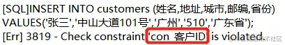 当我们插入一条数据进去时,邮编的长度不等于6时,就会提示报错,如下图: