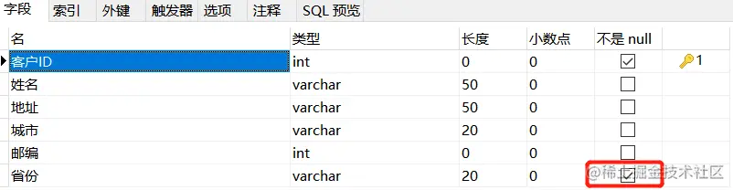 我们可以将"Customers"表中的"省份"由NULL约束改成NOT NULL约束