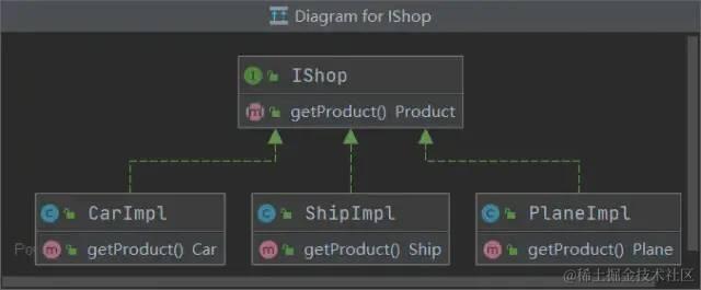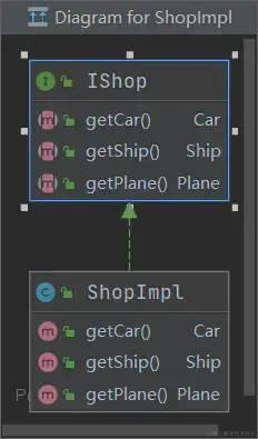 如上图所示:一个接口IShop,有一个实现类ShopImpl,获取三种产品的方法在这个接口中定义了三次。