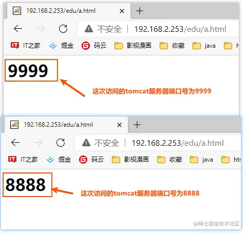 在浏览器地址栏输入地址 http://192.168.2.253/edu/a.html,负载均衡效果,平均请求到8888和9999端口中。