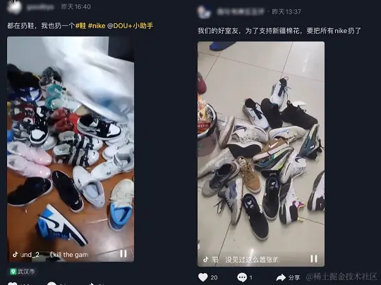 部分网友在网上发视频扔鞋。阿迪、匡威、HM,在他们的镜头下被“扔掉”