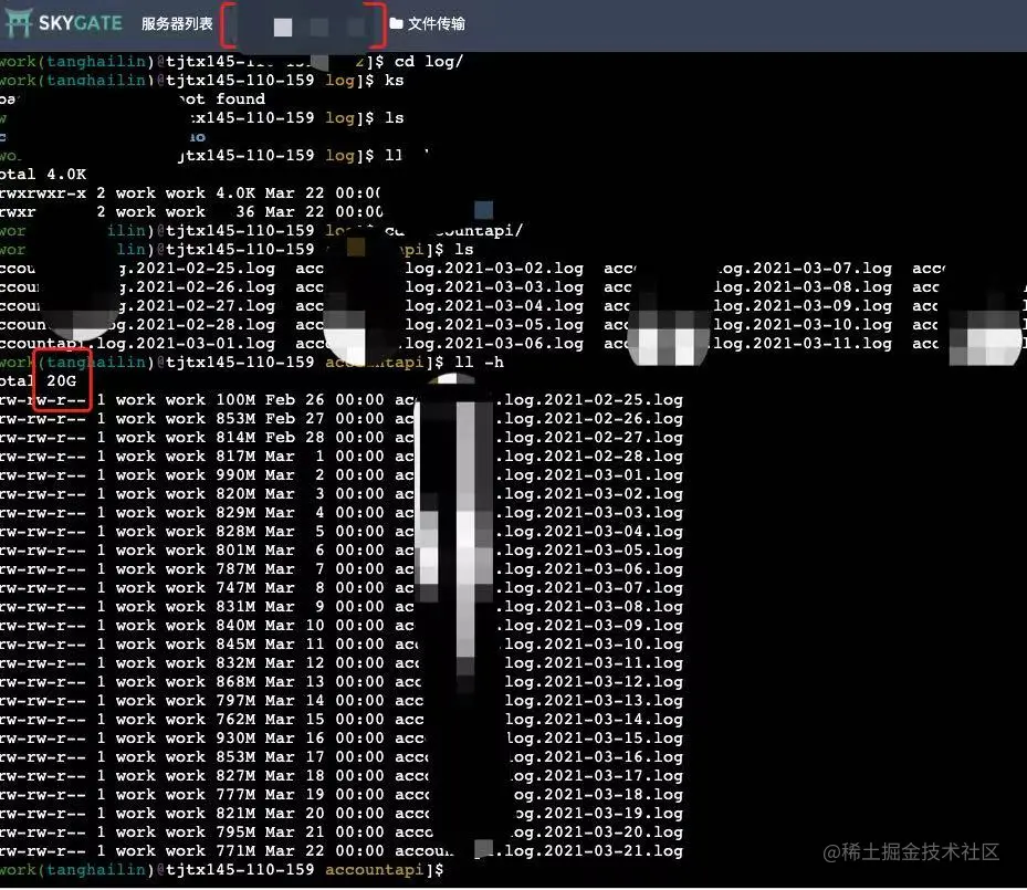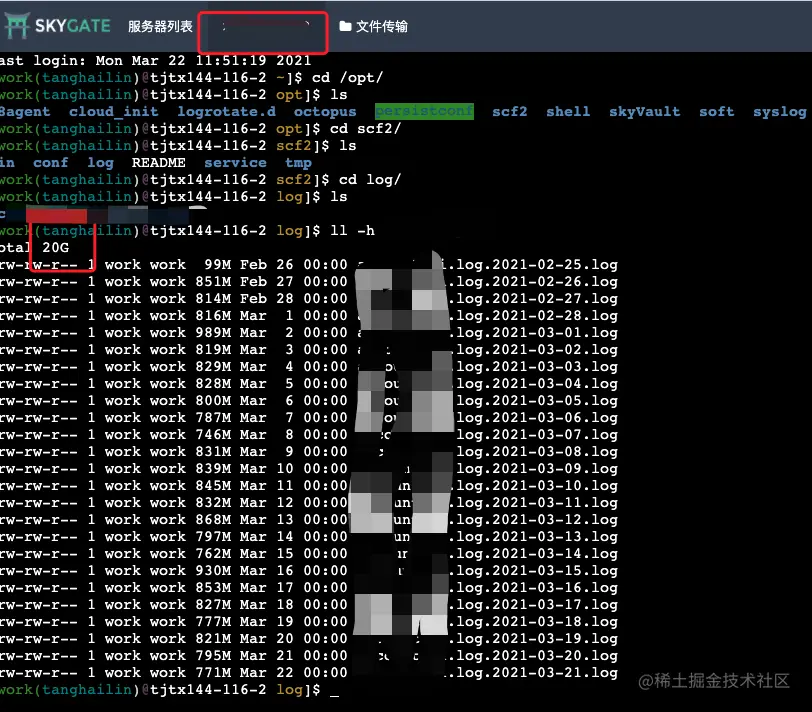 你看,从2月25号日志到现在3.21号的日志都在,总共占用了20G。我问了运维每台容器分配30G。20G/30G=66.7%。单纯日志已经占用磁盘空间的66.7%,再加上其他的应用,占用70+%。实锤了,找到真凶了。我也没想到这么快找到。