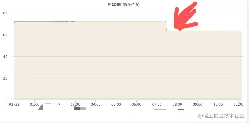 我当时是7点左右看到的消息,看到后,磁盘的使用率达到72%,超过了设定阈值70%。就如上图的红色箭头所示。