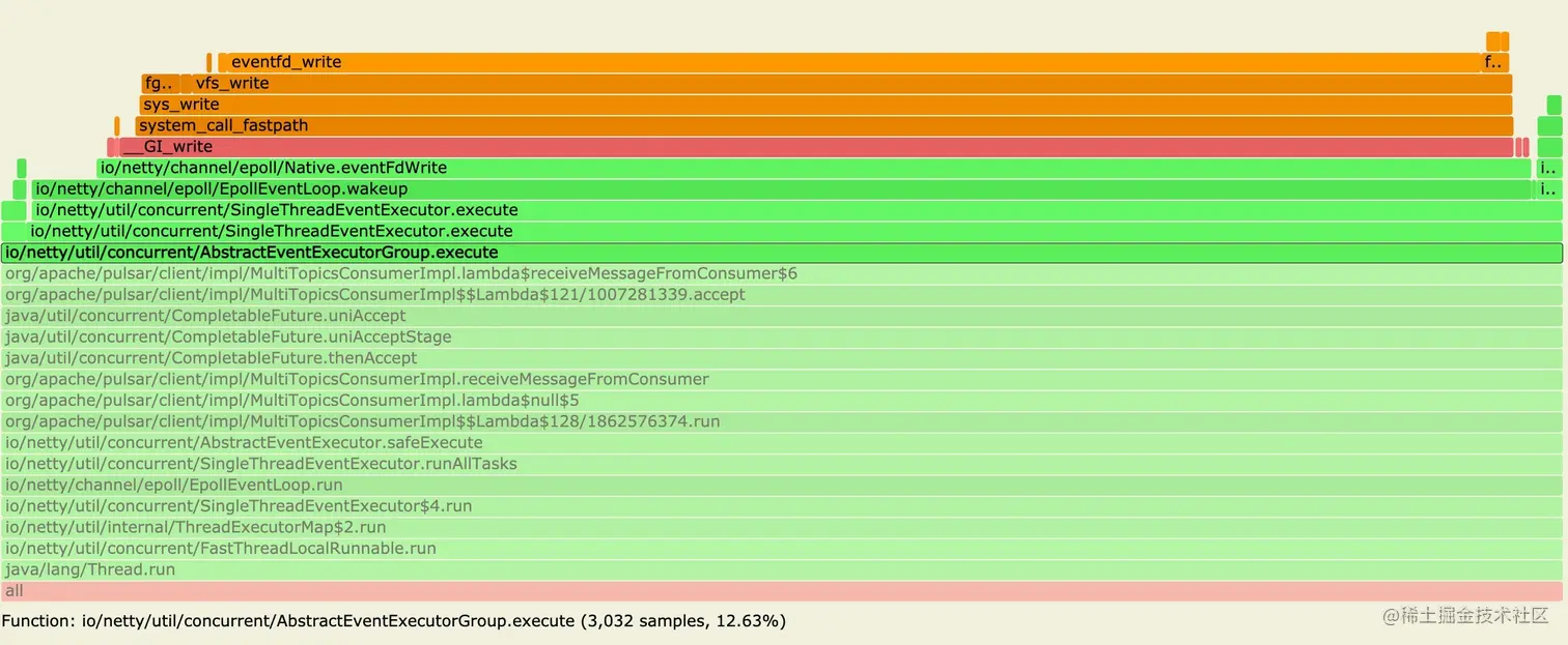 继续回到刚才的火焰图,我们发现除了锁占用了很多的 CPU,Netty 相关的 API 也占用了不少,⼀共有 12.63%。