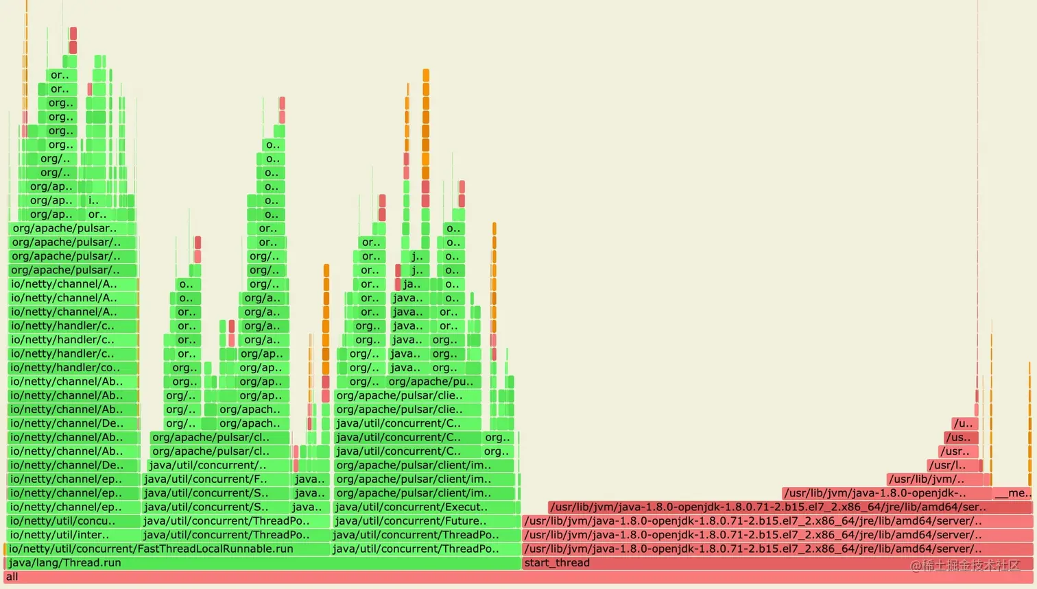看完这个结果,我感觉这个起点很低,有巨大的上升空间。首先,我们需要知道时间都去哪了,于是我拉了⼀个火焰图看看CPU时间的消耗。