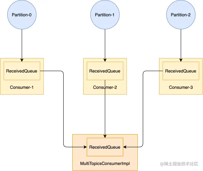 多个 ConsumerImpl 各自接收消息,最终所有消息会汇总进 MultiTopicsConsumerImpl 的队列里,供业务使用。如下所示: