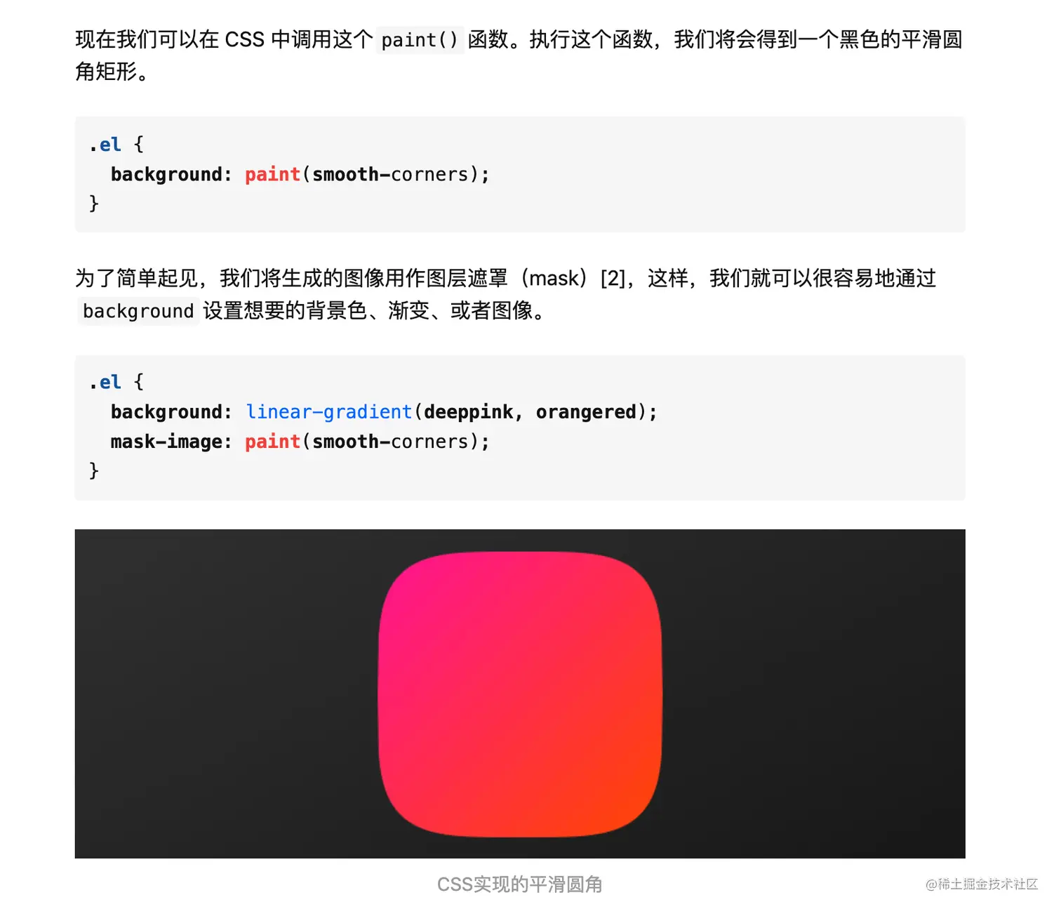 但其实还有一种有意思的方法,刚好可以介绍一个这个有意思的新API,有了他就可以用CSS的方式,来还原这个圆角矩形。那就是“Painting API”,目前是草案阶段,功能很强大,值得了解一下。