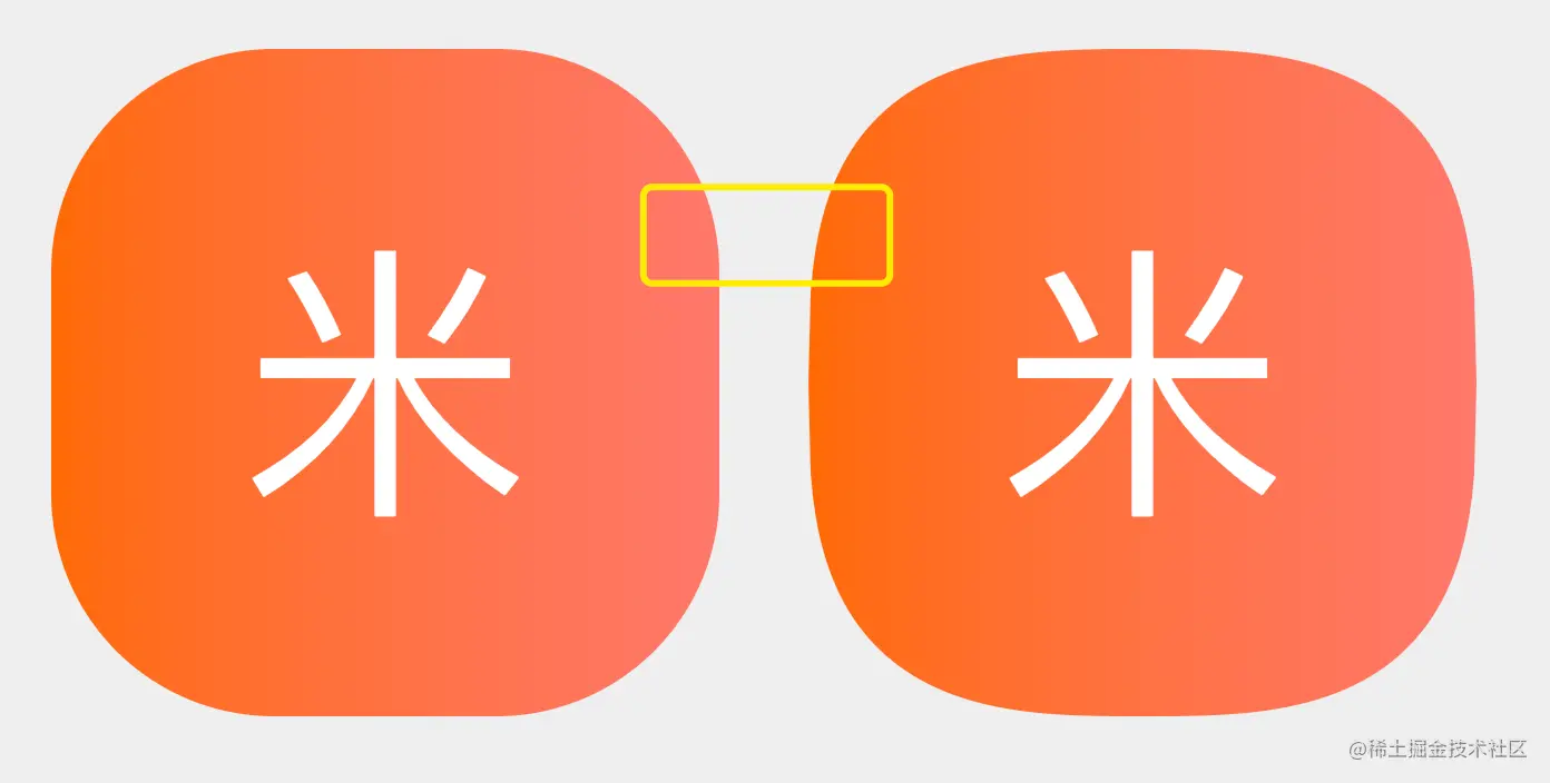 所以用border-radius做出的圆角矩形,在圆角曲线与直线的连接处可以看到比较明显的折角,而小米新Logo的圆角矩形,是曲率连续的圆角矩形,线条更加流畅,对比如下图。