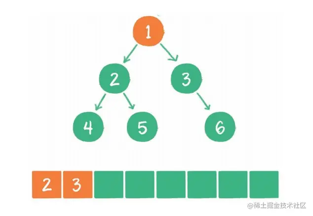 2. 节点 1 出队,输出节点 1 ,并得到节点 1 的左孩子 节点 2 和右孩子节点 3,让节点 2 和节点 3 入队