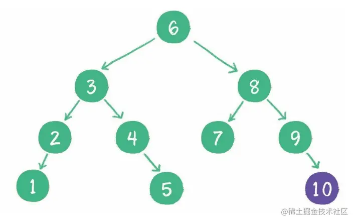 新插入一个节点10, 由于10 > 6, 10 > 8, 10 > 9, 则节点10将会插入到节点9的右孩子的位置