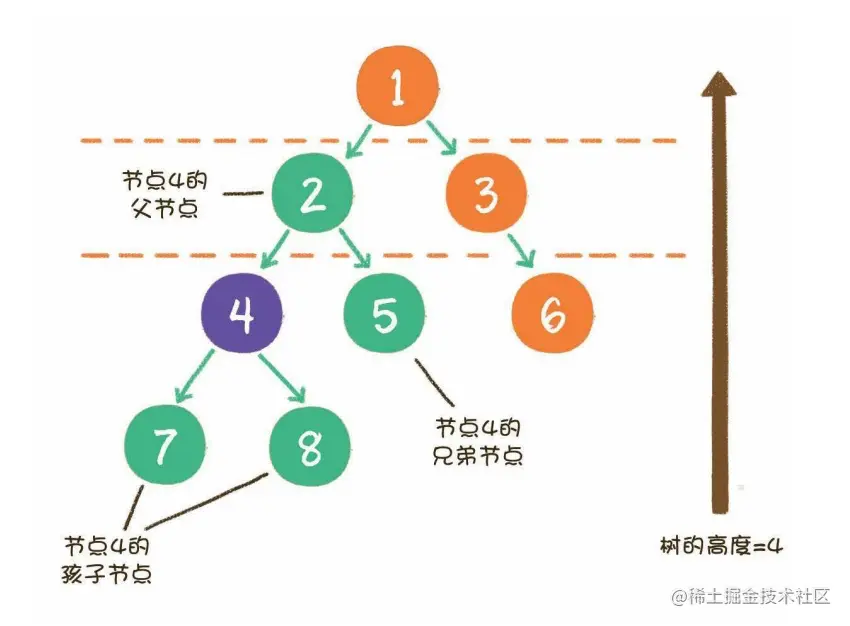 节点4的上一级节点,是节点4的父节点(parent), 从节点4衍生出来的节点, 是节点4的子节点(child),和节点4同级的,由同一个父节点衍生出来的节点,称为节点4的**兄弟节点(sibling),**树的最大层级数,称为树的高度或深度,上图的这个树的高度是4