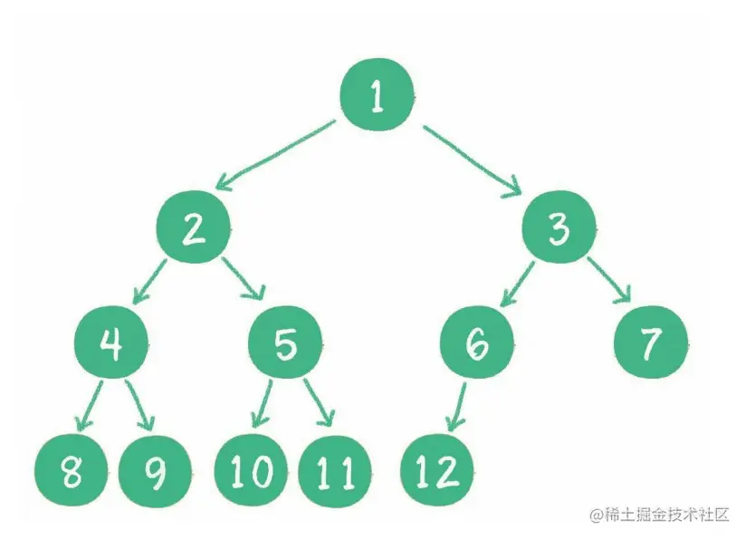 这个二叉树的编号从1到12,和前边的满二叉树编号从1到12的节点位置完全对应,因此这个树是完全二叉树