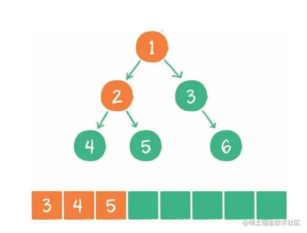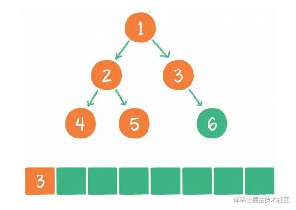 4. 节点 3 出队,并得到 节点 3 的右孩子 节点 6,让节点 6 入队