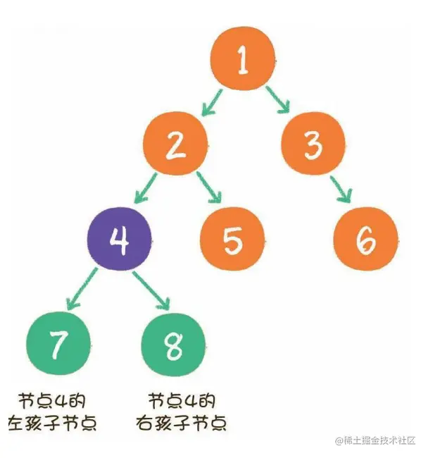 3. 由于节点 2 也存在左孩子,输出左孩子节点 4