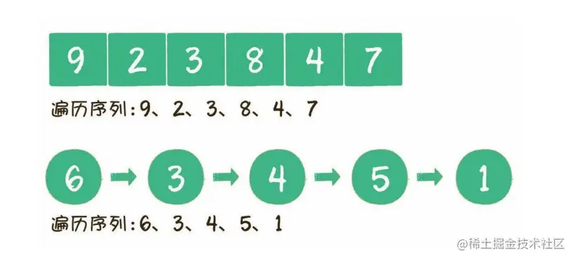 在计算机程序,遍历本身是一个线性操作,所以遍历同样是线性数据结构的数组和链表是一件轻而易举的事情