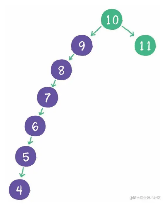 不仅外形变得怪异了,查询的时间复杂度也变成了 O(n),解决这个问题就涉及到了二叉树的自平衡