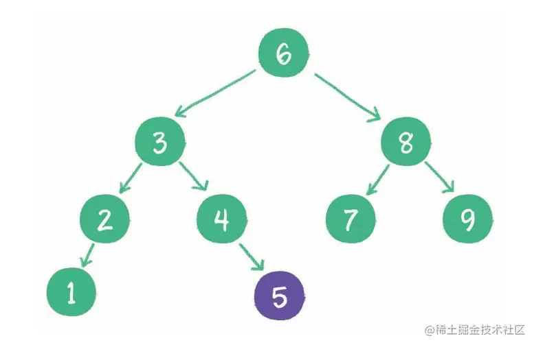 如上例子,新插入一个节点5,由于 5 < 6, 5 > 3, 5 > 4,则节点5将插入到节点4的右孩子的位置