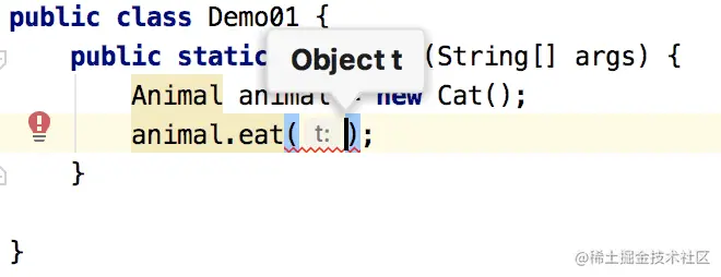 首先我们定义了一个 Animal 接口,里边定义了一个 eat 方法,同时声明了一个泛型。Cat 实现了 Animal 接口,将泛型也定义为了 String。当我调用的时候,声明类型是 Animal,实际类型是 Cat,这个时候调 eat 方法传入了 Object 对象大家猜猜会怎么样?如果调用 eat 方法时传入的是 String 类型那就肯定没问题,但如果不是 String 呢?