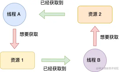 比如,线程 A 已经持有资源 2,而想请求资源 1, 线程 B 已经获取了资源 1,而想请求资源 2,这就形成资源请求等待的环形图。