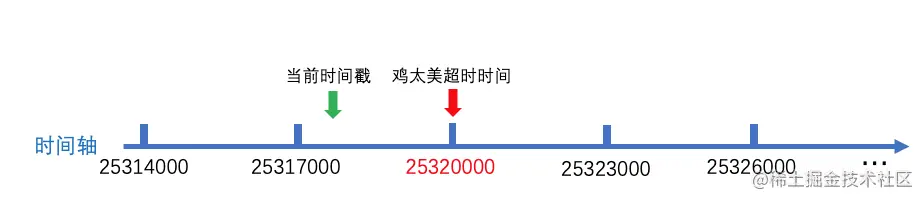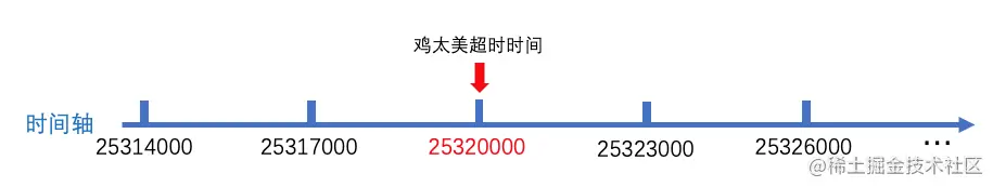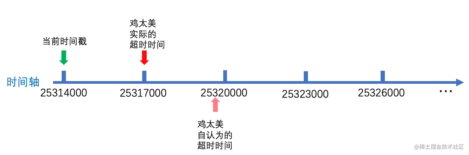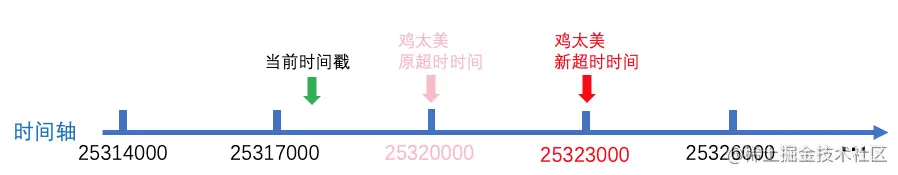 马果果会根据当前时间戳(绿色箭头处)加上鸡太美之前设置的超时时间(6000),重新计算出新的超时时间: