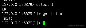 - 切换到DB1中查看hello没有查到。且6379后面有了数据库索引值。这个时候在DB1新增hello并进行删除。看看另外一个监听DB0的监听器会不会有响应