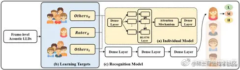 (2)模型方法:对于每一段音频,每人对它的情绪感知不一样,传统采用投票机制,选择众数作为唯一标签。本文采用不同的策略,对每个人的情感标签进行预测。基本模型是BLSTM-DNN模型,下图中的(a)部分。训练数据的标签分成三部分,一个是每个人的硬标签(唯一),另外两个是除了该目标人的其他人的软标签和硬标签。三类标签数据分别用BLSTM-DNN模型单独训练。然后冻结BLSTM-DNN参数,将各BLSTM-DNN的denselayer层的输出拼接,再叠加三个Dense layers,最后softmax到个人的硬标签。因此预测阶段,每个人有对应的情绪感知,当存在N个人的话,将有N个模型。