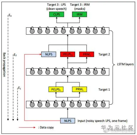 (2)模型方法:本文章是一个语音增强模型。输入带噪频谱,目标是生成纯净语音的频谱以及ideal ratio mask,中间有三层的LSTM层,每层会生成一些频谱特征以及相应的mask。最后一层输出生成的纯净语音频谱和IRM。