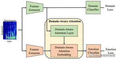 (2)模型方法:输入同一频谱图,分成两部分,一部分到Domain-AwareAttention模块(time pooling, channel poolingand fully connected layer, respectively),另一部分至Emotion模块,做timepooling, channel-wise fully connected(各channel分别全连接)。然后Domain模块输出一个向量,将向量变成对角矩阵,与Emotion模块的输出矩阵相乘,使得领域信息融入到emotionembedding。最后多任务学习,分别求Domain loss和Emotionloss。这里的Domain并不是指不同领域的数据,而是指性别、年龄等额外信息。