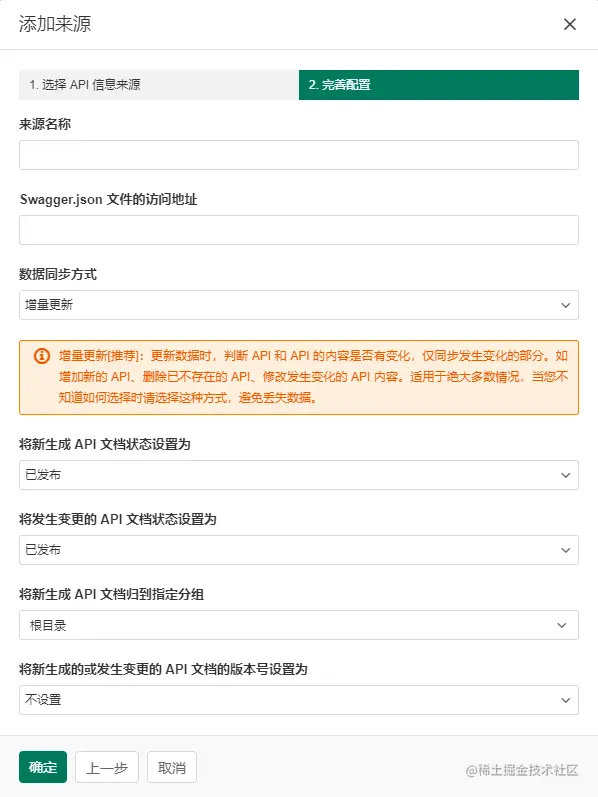 填写信息后,还可以设置同步方式、API文档的状态、分组等信息,还可以记录本次生成的API版本。