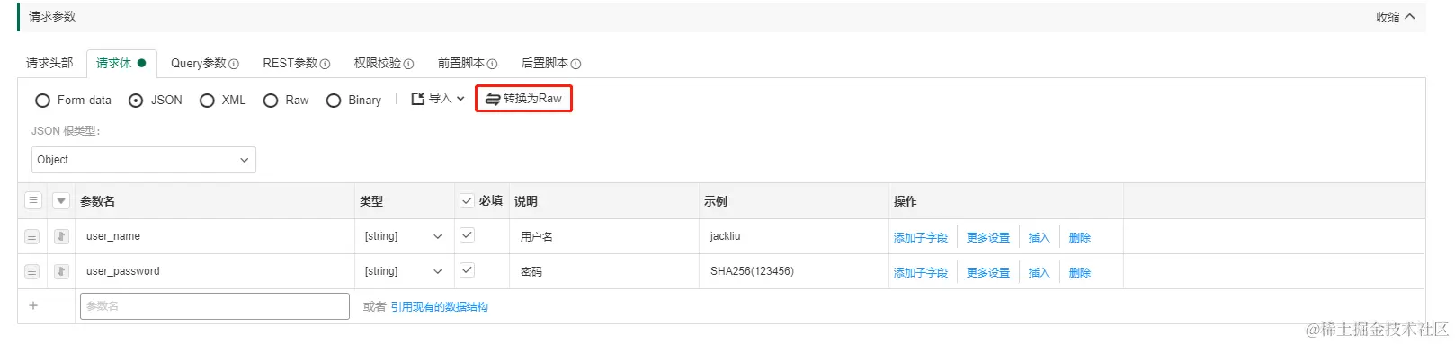 Eolinker在编辑器中提供了API的JSON语法与UI中生成的交互式API文档之间轻松切换的功能。在界面上可以快速切换请求格式,关联格式之间支持转换,例如JSON格式转换为RAW格式,不管对初学者还是有经验的团队成员都很友好,方便用户更轻松地定义API。并通过单击转换按钮进行格式转换。