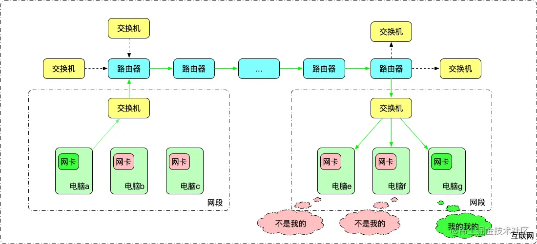 数据帧是网络传输的基本单位,网段内主机可以直接相互通信;每个网段有一交换机,外来数据帧由交换机广播给所有主机,发往外的数据帧,由交换机统一转发给上级路由器;每个路由器负责多个网段,路由器之间进行数据帧转发,并把自己负责网段内的数据帧分发给对应的交换机。