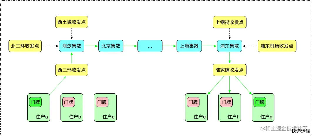 快件是快递运输的基本单位,片区内住户可以直接互送快件;每个片区有一收发点,外来快递由收发点统一派送,送往外部的快递,由收发点统一转发给上级集散站;每个集散站负责多个片区,集散站之间进行快递转发,并把属于自己片区内的快递分发给对应收发点。