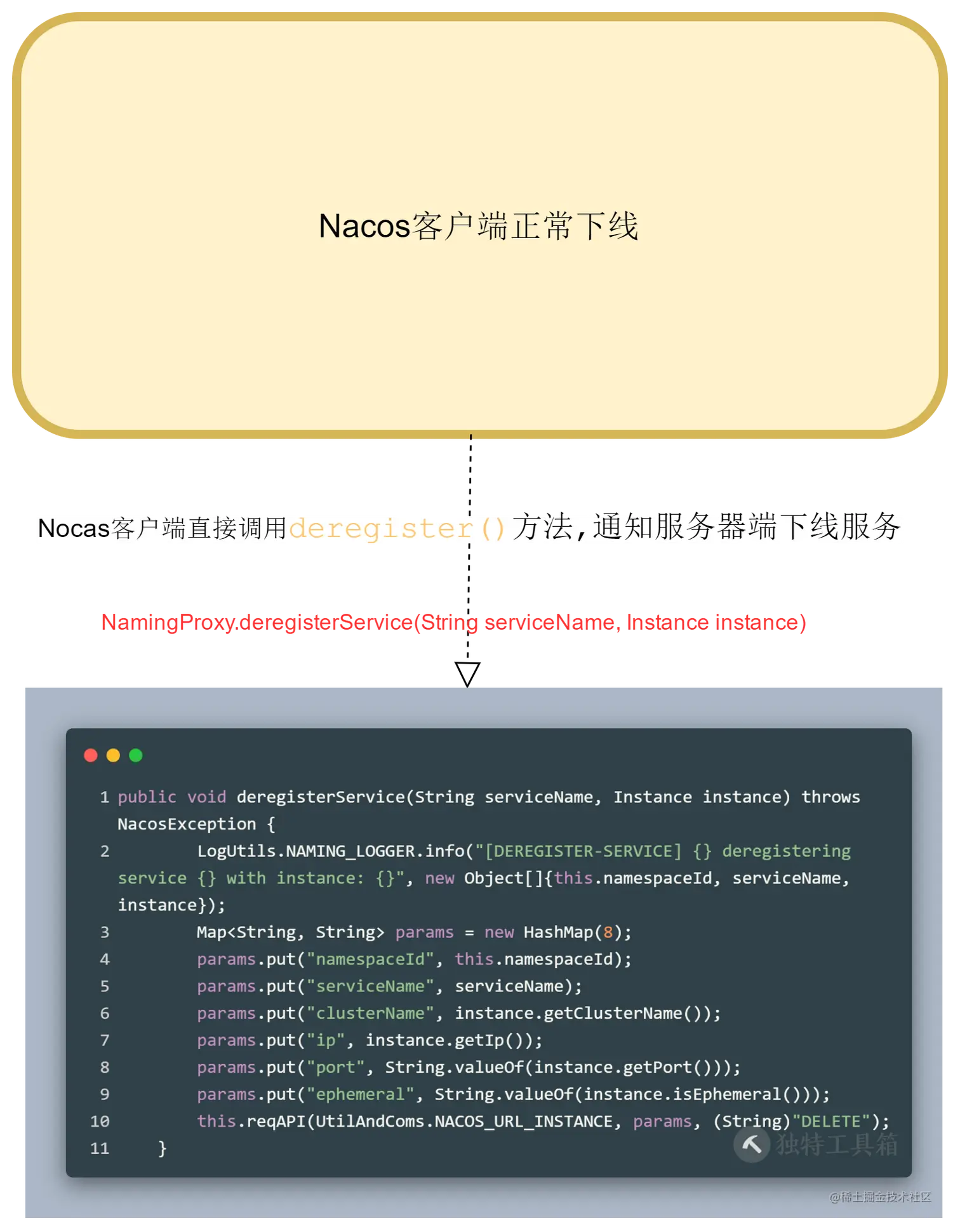Nocas客户端直接调用deregister()方法,通知服务器端下线服务